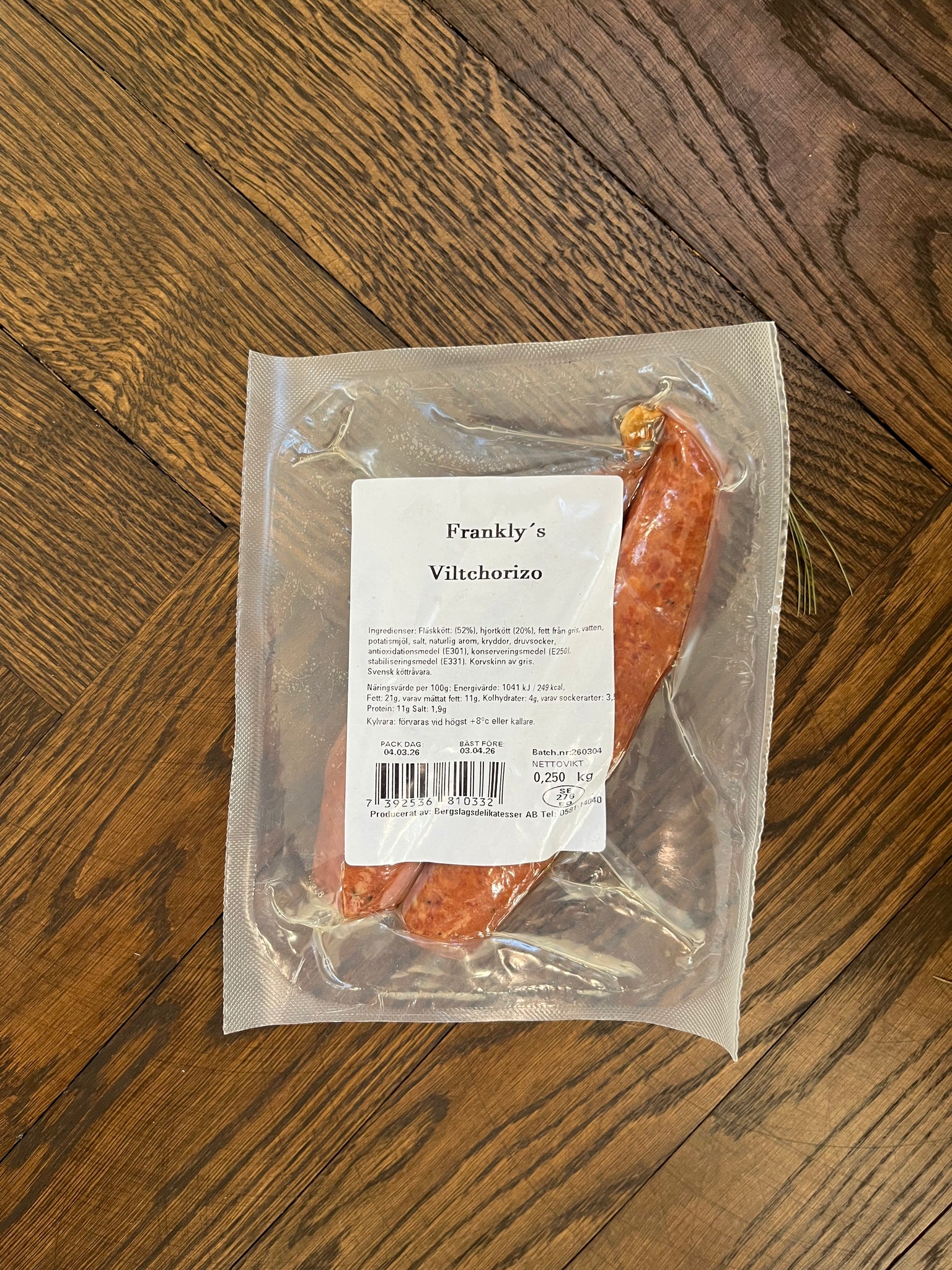 Innehåll: Fläsk och hjortkött (72%), fett från gris, vatten, potatismjöl, salt, naturlig arom, druvsocker, kryddor, antioxidationsmedel (E300 (askorbinsyra) E301 (natriumaskorbat), konserveringsmedel (E250), antioxidant (E331). Stoppad i naturtarm av lamm.