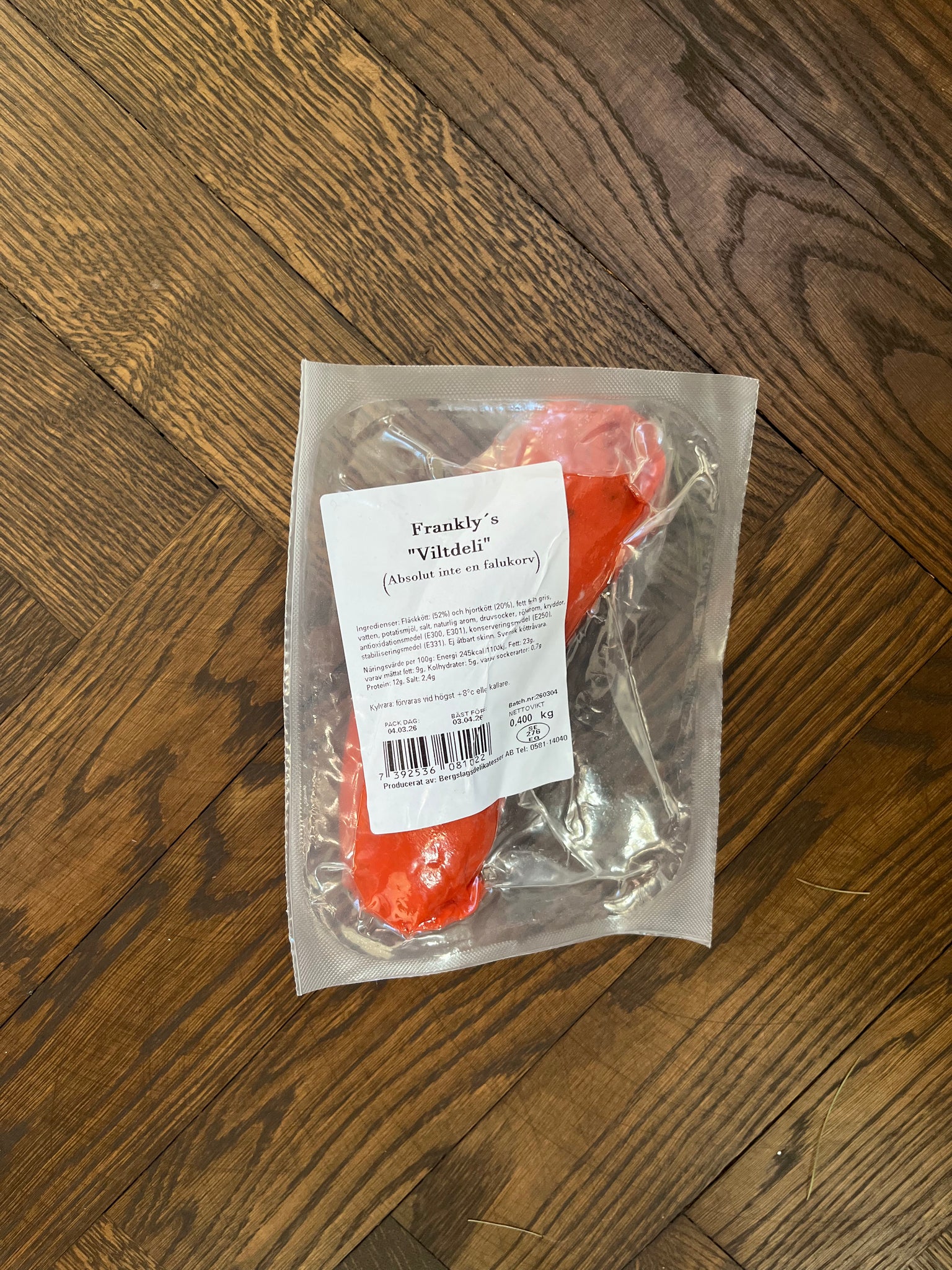 Ett paket innehåller en korv a 400 gram, totalvikt ca 400 gram